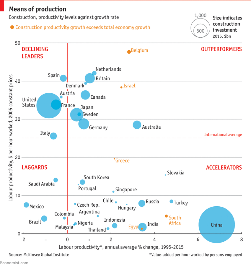 De acuerdo a Mckinsey Global Institute, el sector constructor ha decaído a escala mundial en las últimas 2 décadas. Mientras otras industria evolucionan, como la manufacturera que progresó 3.6%, la construcción solo creció 1%.